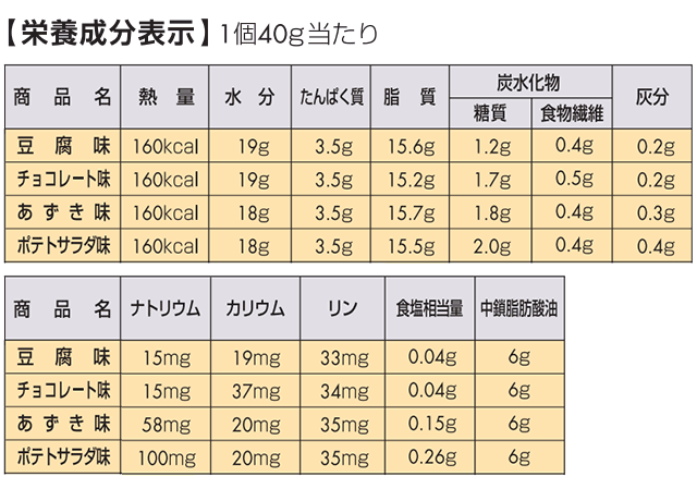 【原材料】 [豆腐味] 食用油脂(菜種油、MCT(中鎖脂肪酸油))(国内製造)、乳たんぱく、コラーゲンペプチド(ゼラチン)、大豆たんぱく、寒天/トレハロース、糊料(増粘多糖類:りんご由来、セルロース)、乳化剤 [チョコレート味] 食用油脂(菜種油、MCT(中鎖脂肪酸油))(国内製造)、乳たんぱく、砂糖、コラーゲンペプチド(ゼラチン)、大豆たんぱく、ココアパウダー、寒天/糊料(増粘多糖類:りんご由来、セルロース)、乳化剤、香料、甘味料(スクラロース) [あずき味] 食用油脂(菜種油、MCT(中鎖脂肪酸油))(国内製造)、乳たんぱく、砂糖、コラーゲンペプチド(ゼラチン)、大豆たんぱく、食塩、寒天/糊料(増粘多糖類:りんご由来、セルロース)、乳化剤、香料、着色料(カラメル、クチナシ)、甘味料(スクラロース、アセスルファムK) [ポテトサラダ味] 食用油脂(菜種油、MCT(中鎖脂肪酸油))(国内製造)、乳たんぱく、コラーゲンペプチド(ゼラチン)、大豆たんぱく、食塩、チキンブイヨン、ポークエキス、寒天、香辛料/トレハロース、香料、糊料(増粘多糖類:りんご由来、セルロース)、乳化剤、調味料(アミノ酸等)、くん液 【アレルギー】 豆腐味…乳、ゼラチン、大豆、りんご チョコレート味… 乳、ゼラチン、大豆、りんご あずき味… 乳、ゼラチン、大豆、りんご ポテトサラダ味… 乳、ゼラチン、大豆、りんご、鶏肉、豚肉